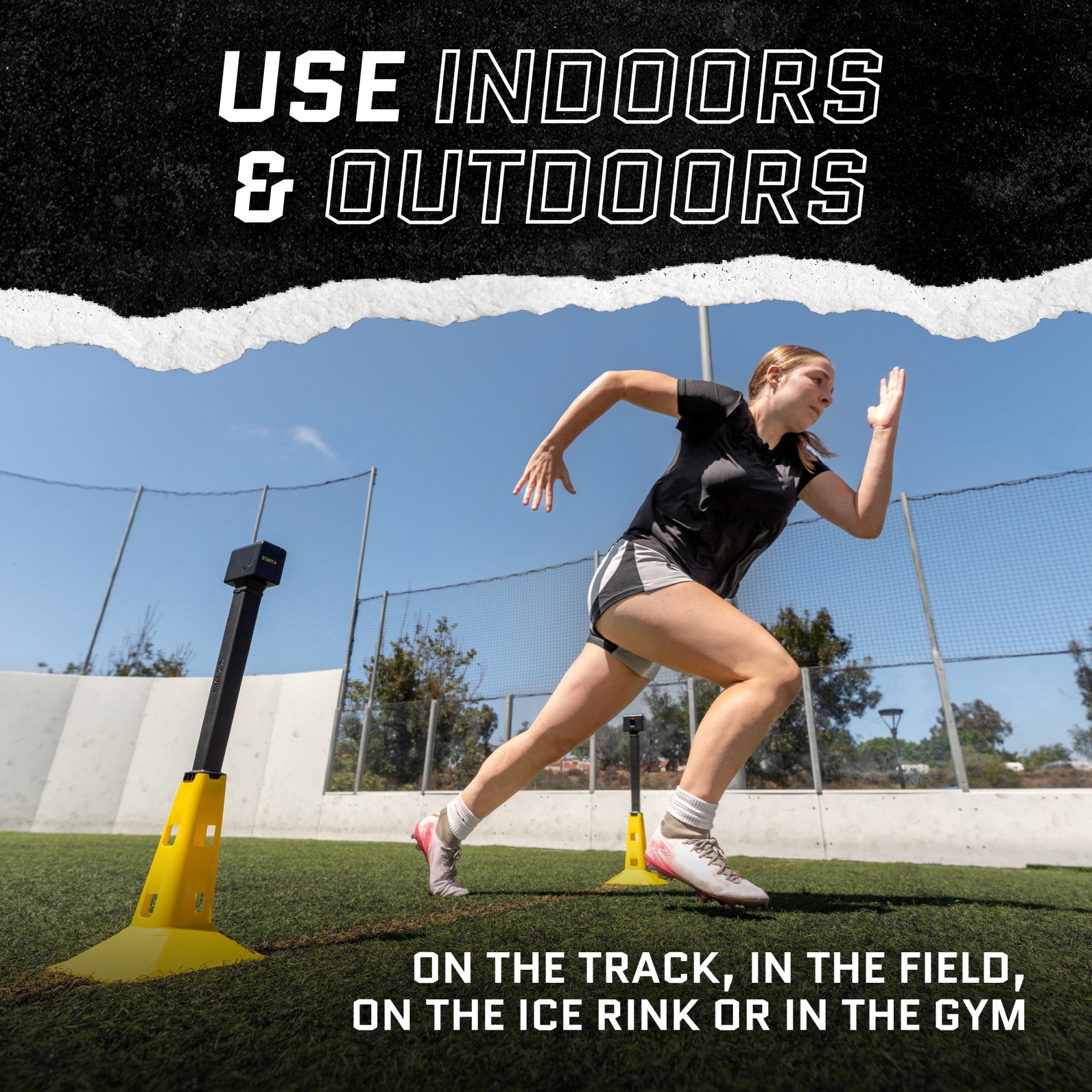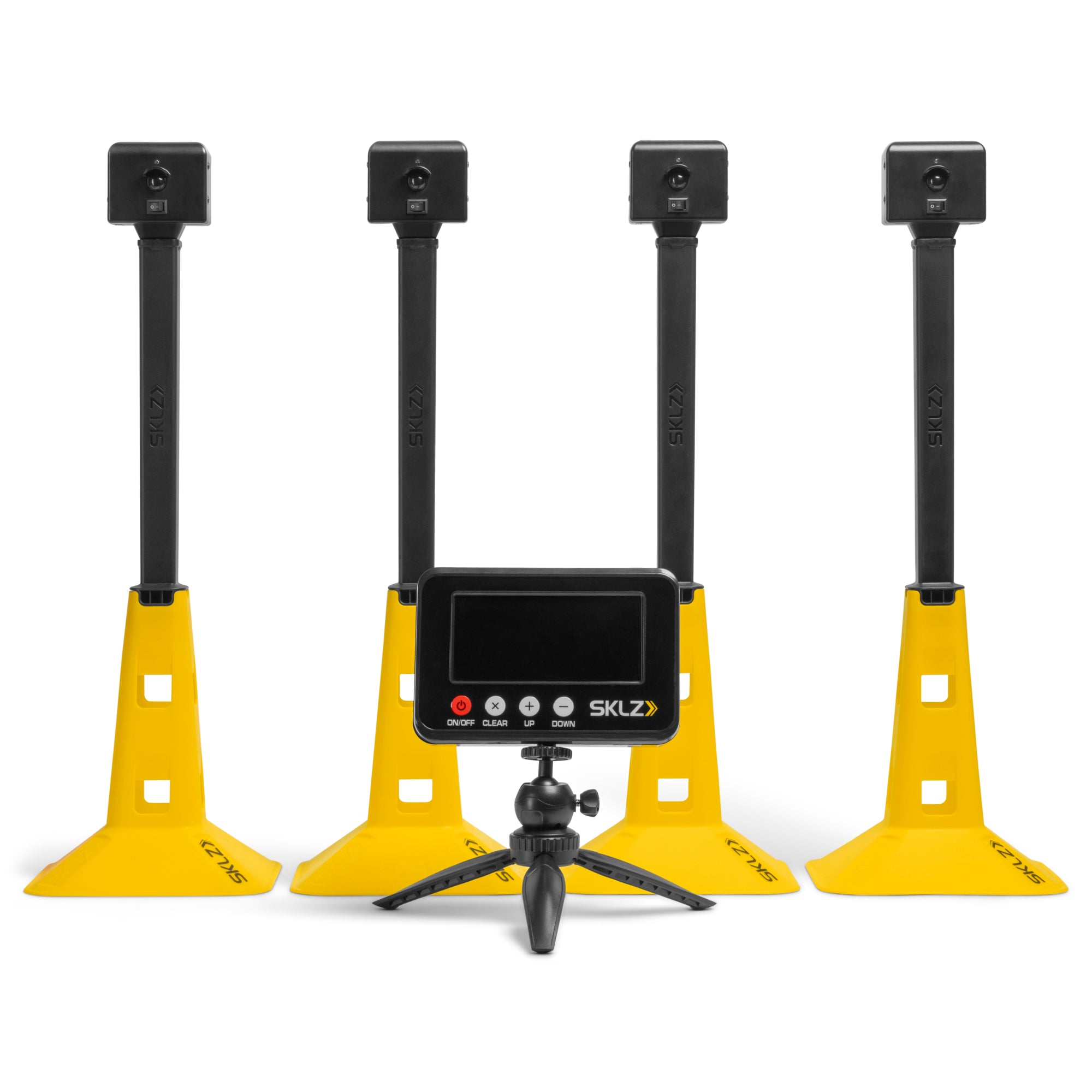 The Speed Gates Pro is designed for accurate, reliable speed and agility timing across a wide range of training environments. With four radio frequency sensors, it records times up to 50 yards, making it ideal for drills such as the 40-yard dash. Setup is simple with alignment lights confirming correct connection, and extension poles ensuring sensors are tall enough to prevent misreads. The LED timer is bright and visible both indoors and outdoors, allowing use on the track, in the field, in the gym, or on the ice. Timer memory stores up to 50 recent results, letting athletes and coaches review and compare times. Gate placement is versatile, whether for straight sprints, laps around a rink, or running the bases. The Speed Gates Pro also includes rechargeable lithium batteries and a charging cable, eliminating the need to purchase disposable batteries. When training is finished, all components fit into the included carry bag for convenient transport. With start and finish cones, sensors, timer, extension poles, and power accessories, the Speed Gates Pro offers a complete timing solution for performance measurement.