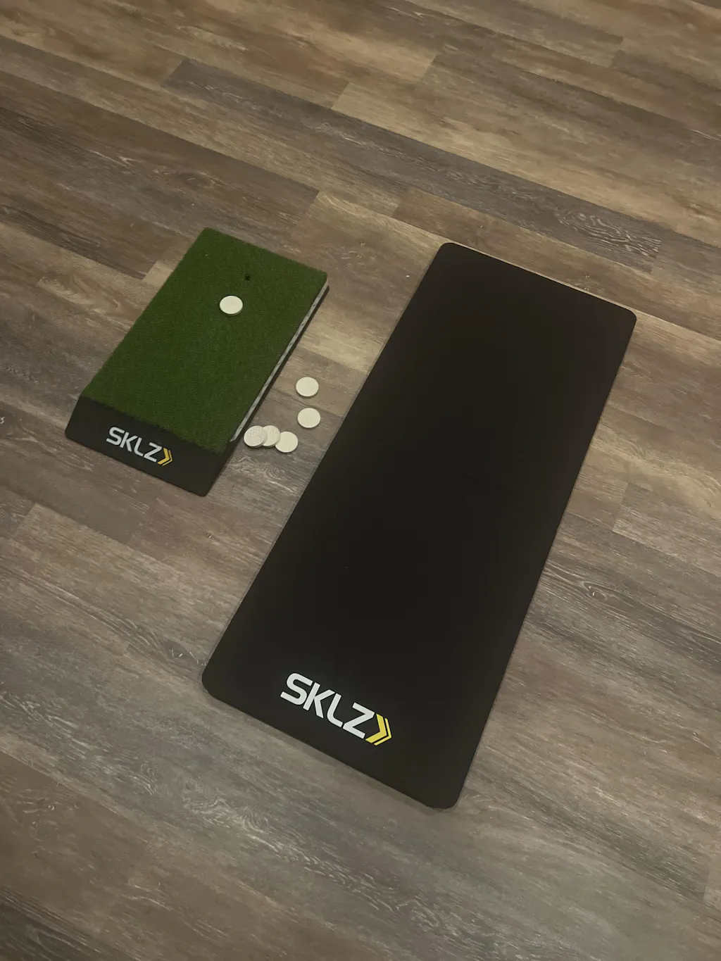 The SKLZ Pure Divot Mat is a golf training mat designed for swing practice with a compressed foam surface that absorbs impact and provides a realistic feel. Sized at 18" x 11", it works with every club in your bag while remaining compact for easy storage. The included stance mat ensures level footing, reinforcing proper setup. The anti-slip leather bottom helps minimize slippage, keeping the mat stable during practice. Unlike traditional 5’x4’ range mats, this foldable mat requires less space while still delivering an effective training experience. For added versatility, the included rubber tee allows for driver use. Whether working with irons, wedges, or drivers, this golf hitting mat provides a practical setup without the bulk of a full-size range mat.